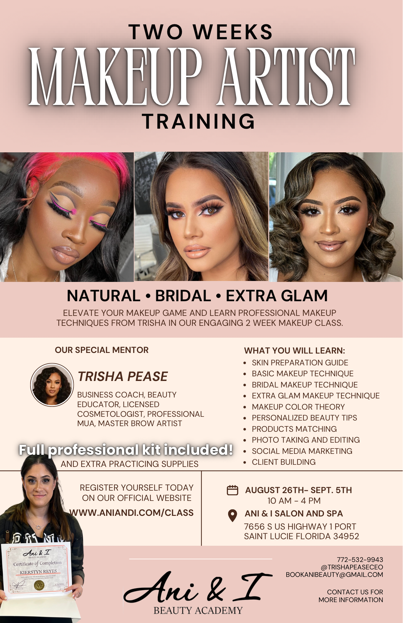 You'll receive undivided attention, hands on with models, manuals, kits, practice sheets and faces & more! Have questions contact us directly at: 772-532-9943